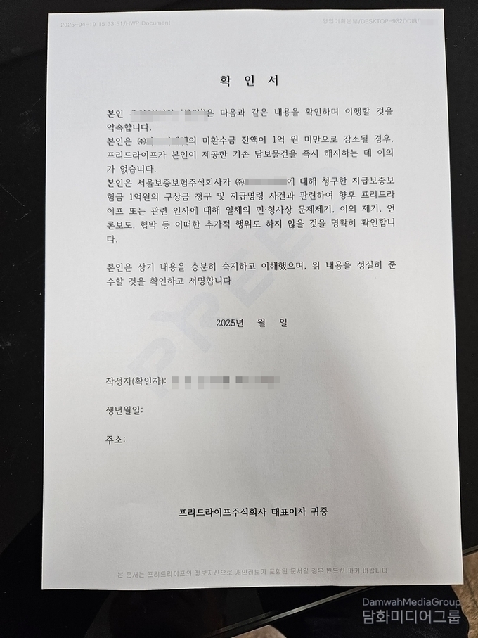 본지가 단독 입수한 2025년 4월 10일자 ‘확인서’는, VIG 경영 체제의 프리드라이프가 웅진그룹으로의 매각을 앞두고 불법 의혹(가상계좌 대납 강요 등) 노출을 차단하기 위해 협력업체와의 ‘입막음’ 합의를 시도한 정황을 담고 있다.