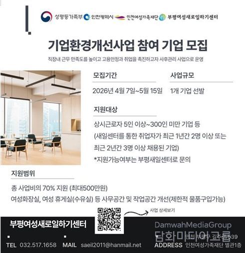 시민행정신문 이세훈 기자 | 부평여성새로일하기센터는 여성친화적 근무환경 조성과 경력보유여성의 안정적인 고용 확대를 위해 '2026년 기업환경개선사업' 참여기업을 모집한다고 밝혔다.