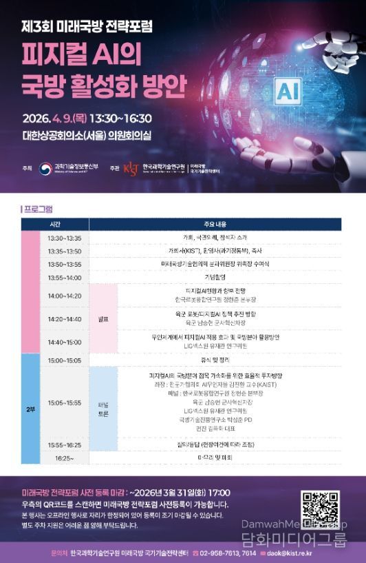 시민행정신문 이존영 기자 | 과학기술정보통신부는 한국과학기술연구원(원장 오상록)과 함께 4월 9일 대한상공회의소에서 제3회 미래 국방 전략 토론회(전략 포럼)(‘물리적 인공지능'피지컬AI'의 국방 활성화 방안’)을 개최했다고 밝혔다.