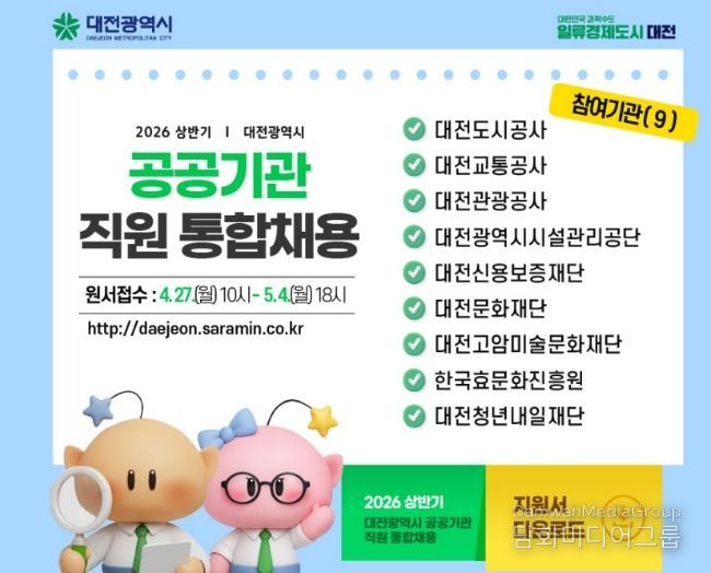 시민행정신문 강갑수 기자 | 대전시가 유능한 인재 확보를 위해 2026년 상반기 산하 공공기관 직원 통합채용을 실시한다.