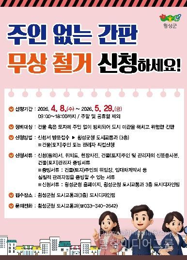 시민행정신문 강갑수 기자 | 횡성군이 건물이나 토지에 주인 없이 방치된 간판의 무상 철거를 지원하는 '2026년 주인 없는 간판 정비사업'을 추진한다고 10일 밝혔다.