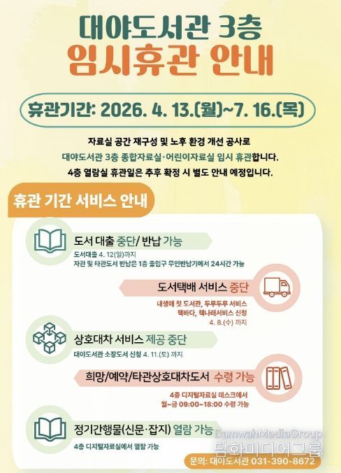 시민행정신문 강갑수 기자 | 군포시 대야도서관은 노후된 자료실 환경을 개선하고 이용자 중심의 효율적인 공간 재구성을 위해 오는 4월 13일부터 7월 16일까지 리모델링 공사를 실시하고, 해당 기간동안 3층 자료실을 임시휴관한다고 밝혔다.