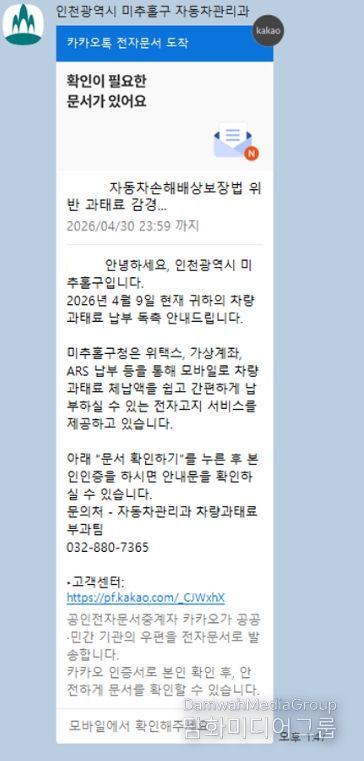 시민행정신문 강갑수 기자 | 인천 미추홀구는 자동차 의무보험 미가입 및 정기 검사 지연 과태료에 대한 구민들의 납부 편의를 높이고 체납 발생을 예방하기 위해 오는 4월 15일부터 ‘카카오톡 전자고지 및 모바일 납부 서비스’를 시행한다고 밝혔다.