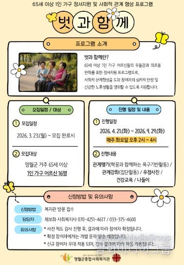 시민행정신문 기자 | 영월군종합사회복지관은 관내 65세 이상 1인 가구 어르신을 대상으로 정서 지원과 교류 확대를 위한 프로그램 ‘벗과 함께’ 참여자를 모집한다.