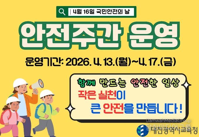 시민행정신문 기자 | 대전시교육청은 국민안전의 날(4월 16일)을 맞아 교직원과 학생들의 안전의식을 높이고 안전 실천 문화를 확산하기 위해 4월 13일부터 17일까지 ‘2026년 안전주간’을 운영한다고 밝혔다.