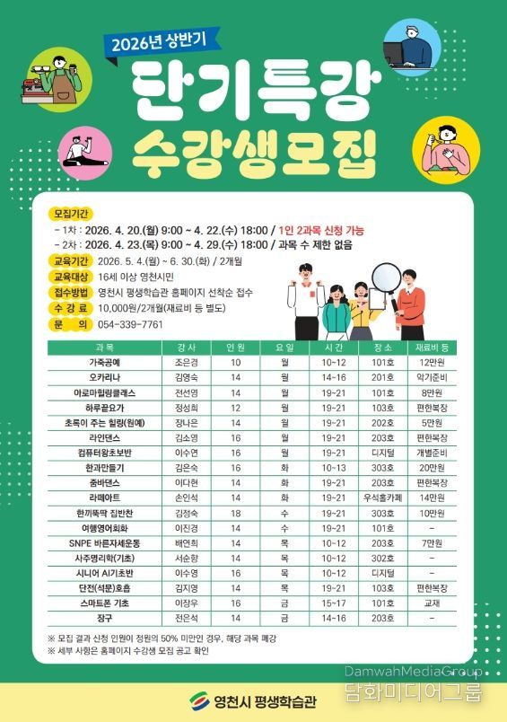 시민행정신문 강갑수 기자 | 영천시 평생학습관은 시민들의 자기 계발과 여가 활동을 지원하기 위한 ‘2026년 상반기 단기특강’ 수강생을 20일부터 선착순으로 모집한다.