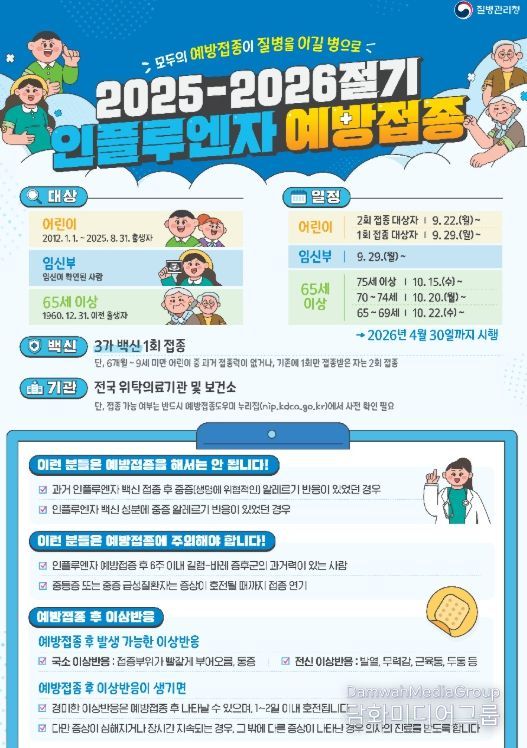 시민행정신문 강갑수 기자 | 광양시는 인플루엔자(독감) 유행에 대비해 국가 및 전라남도 지원사업으로 추진 중인 2025-2026절기 무료 예방접종을 4월 30일까지 실시한다고 밝혔다.