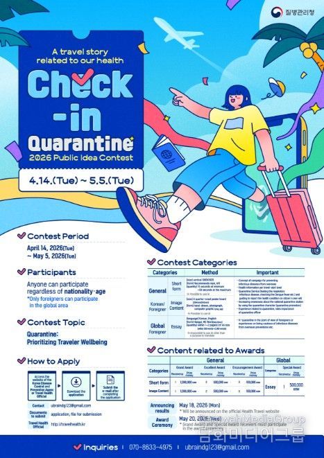시민행정신문 강갑수 기자 | 질병관리청은 건강한 해외여행 문화를 확산하고 여행자 건강 중심 검역에 대한 국민 인식을 높이기 위해 4월 14일부터 5월 5일까지 '체크인, 검역 : 우리가 만드는 여행건강 이야기, 국민 생각 공모전'을 개최한다.