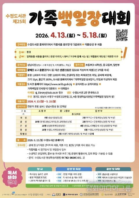 수정도서관 관계자는 “이번 가족백일장을 통해 시민들이 환경의 중요성을 되새기고, 가족과 함께 글쓰기를 통해 공감과 소통의 시간을 갖길 바란다”며 “앞으로도 도서관은 시민이 참여하고 함께 만들어가는 독서문화 활성화를 위해 다양한 프로그램을 지속적으로 운영해 나가겠다”고 밝혔다.