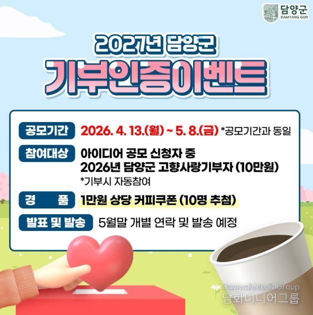 우수 제안자에게는 총 100만 원의 담양사랑상품권이 지급되며, 최우수상 1명(30만 원), 우수상 2명(각 20만 원), 장려상 3명(각 10만 원)을 선정한다. 선정된 아이디어는 향후 담양군 고향사랑기부제 정책 및 기금운용계획 수립에 적극 반영될 예정이다.