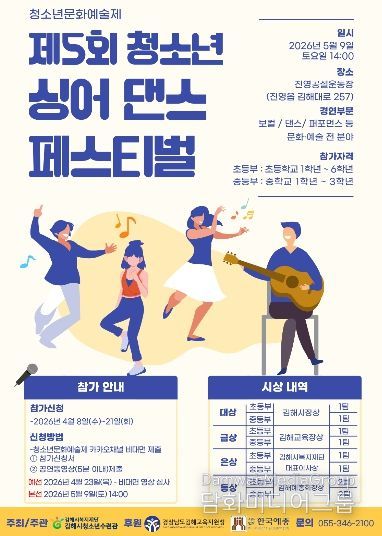시민행정신문 기자 | (재)김해시복지재단(대표이사 임주택) 청소년수련관은 오는 5월 9일(토) 오후 2시부터 4시까지 진영운동장에서 청소년의 달을 맞아 ‘제5회 싱어댄스 페스티벌’을 개최한다고 밝혔다.