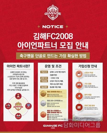 시민행정신문 장규호 기자 | 김해FC2008이 지역 상생 및 경제 활성화를 위한 프로젝트의 일환으로 소상공인과 구단이 함께 성장하는 상생 협력 프로그램‘아이언 파트너’를 모집한다고 밝혔다.