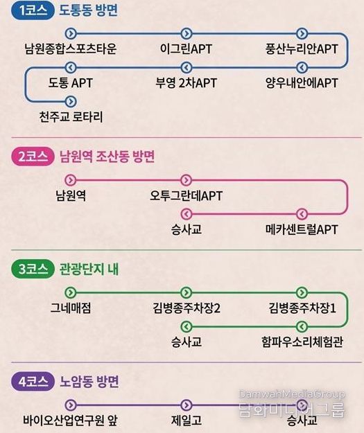 무료 셔틀버스는 총 4개 노선으로 운영되며, 구체적인 구간은 ▲1노선 남원종합스포츠타운 ↔ 천주교 로타리 ▲2노선 남원역 ↔ 승사교 ▲3노선 그네매점 ↔ 승사교 ▲4노선 남원바이오산업연구원 ↔ 승사교 등이다.