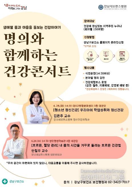 시민행정신문 강갑수 기자 | 꿈이 모이는 도시, 미래를 그리는 강남구가 4월부터 10월까지 ‘명의와 함께하는 건강 콘서트’를 총 4회 운영한다. 이번 건강 콘서트는 강남세브란스병원과 삼성서울병원 의료진이 참여해 청소년 정신건강, 호르몬 건강, 치매예방, 유방암 관리 등 주민 관심이 높은 주제를 다룬다.