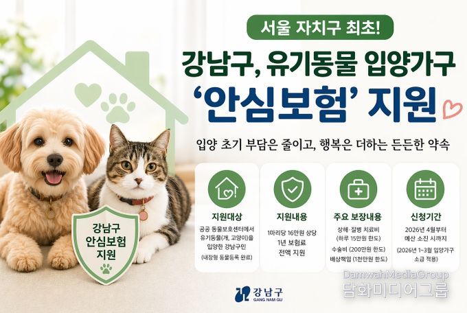 조성명 강남구청장은 “이번 안심보험 지원이 입양을 주저하는 구민들에게 실질적인 도움이 되길 바란다”며 “앞으로도 입양 동물이 소중한 가족의 품에서 건강하게 평생을 함께할 수 있도록 지속 가능한 반려동물 복지 정책을 추진해 나가겠다”고 밝혔다.