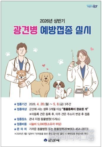 시민행정신문 김학영 기자 | 군산시는 4월 20일부터 5월 8일까지 3주간 관내 동물병원 15개소에서 상반기 광견병 예방접종을 실시한다고 밝혔다.
