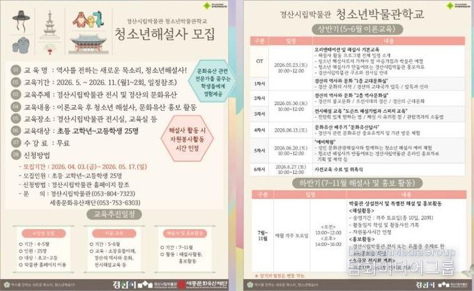 시민행정신문 강갑수 기자 | 경산시 시립박물관은 지역 청소년들이 역사와 문화를 스스로 이해하고 이를 전달하는 주체로 성장할 수 있도록'2026년 청소년박물관학교'를 운영한다고 밝혔다.