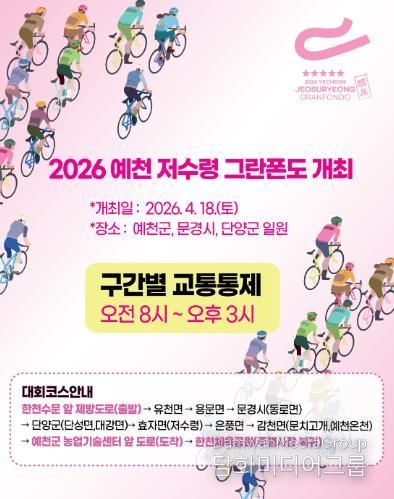 시민행정신문 장규호 기자 | 예천군은 오는 18일 오전 8시부터 오후 3시까지 예천군과 문경시, 단양군 일원에서 '2026 예천 저수령 그란폰도' 대회를 개최한다고 밝혔다.