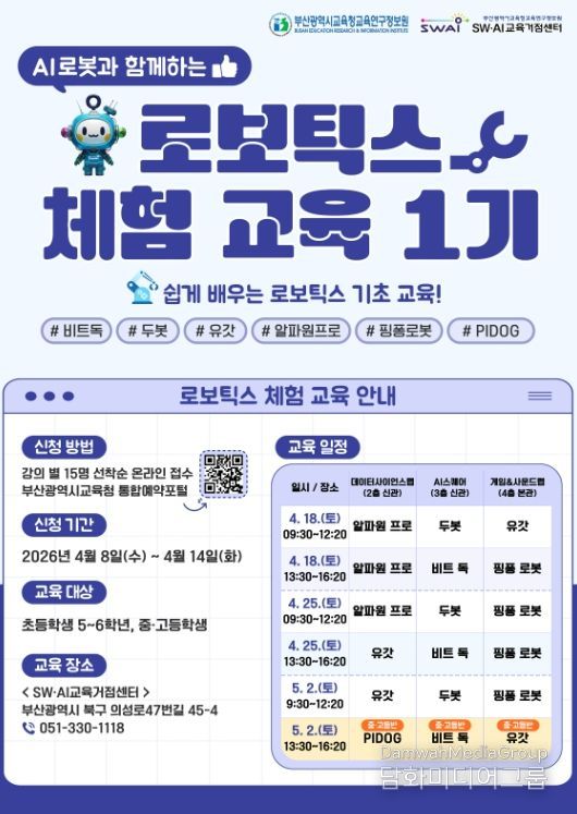 시민행정신문 기자 | 부산광역시교육청교육연구정보원은 오는 18일부터 5월 2일까지 6회에 걸쳐 부산SW·AI교육거점센터에서 초등 5~6학년, 중·고등학생 90명을 대상으로 ‘AI로봇과 함께하는 로보틱스 체험 교육’을 운영한다.