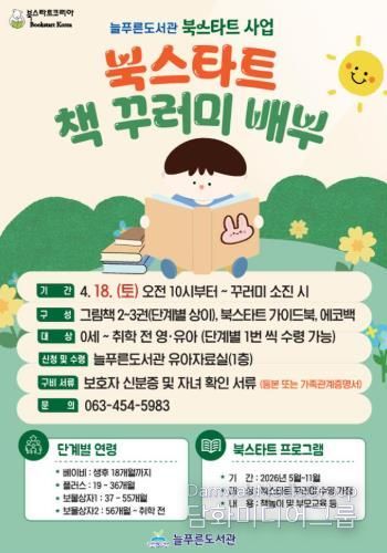 북스타트 꾸러미 신청 및 수령은 4월 18일부터 늘푸른도서관 1층 유아자료실에서 가능하며, 보호자 신분증과 자녀 확인이 가능한 등본 또는 가족관계증명서를 지참하여 현장에서 수령할 수 있다.