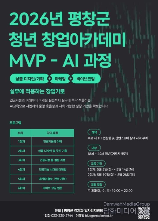 시민행정신문 이세훈 기자 | 평창군은 강원특별자치도 공모사업인 '2026년 지역산업 맞춤형 일자리 창출 지원사업'으로 ‘청년 창업아카데미(MVP)-AI 과정’을 본격적으로 운영한다.