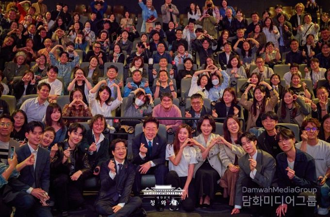 무대 인사를 마치고 사진 촬영을 원하는 관객들의 요청에 이 대통령 부부는 다시 객석 1열에 앉아 손하트를 하며 전체 관객과 단체사진을 촬영했다.