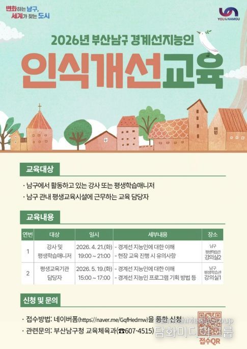 시민행정신문 강갑수 기자 | 부산 남구는 경계선지능인의 이해를 높이고 포용적인 지역사회를 조성하기 위해‘경계선지능인 인식 개선 교육’ 참여자를 모집한다.