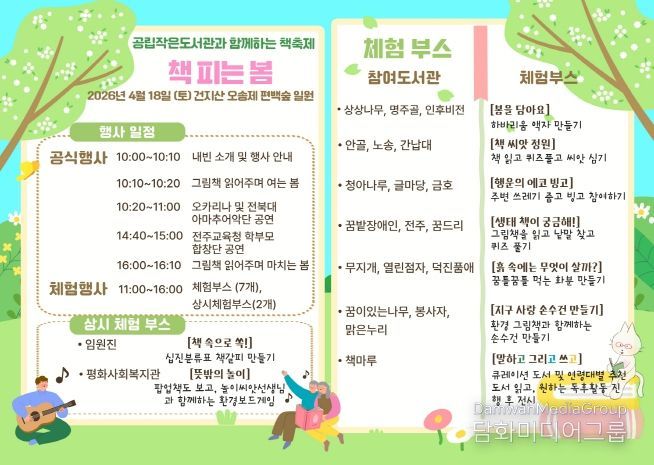 주요 프로그램은 △그림책 읽어주기 △오카리나 및 전북대학교 아마추어 오케스트라의 ‘악기 연주’ △전주교육청 학부모 합창단의 ‘합창 공연’ 등으로, 행사장을 찾은 시민들에게 봄날의 정취를 선사하게 된다.