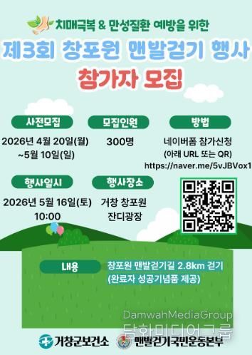 이정헌 보건소장은 “이번 행사를 통해 군민들이 일상 속 걷기 실천을 자연스럽게 이어갈 수 있는 계기가 되기를 바란다”며 “가족, 이웃과 함께 창포원에서 건강한 시간을 보내시길 바란다”고 말했다.