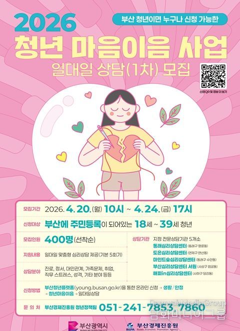 시민행정신문 기자 | 부산시는 정서적으로 어려움을 겪는 청년들의 마음 회복을 돕기 위해 '2026년 청년 마음이음 사업' 참여자를 모집한다고 밝혔다.