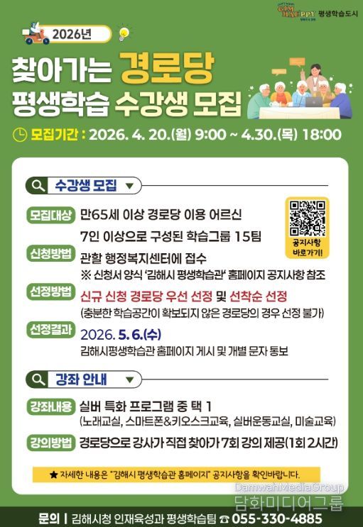 특히 올해는 어르신들의 정서적 안정과 창의성 향상을 위한 ‘미술교육’이 새롭게 추가돼 눈길을 끈다. 선정 결과는 5월 6일 김해시 평생학습관 누리집에 공지된다.