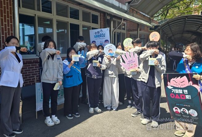 보건소와 교육지원청, 학교 보건교사가 함께한 이번 합동 캠페인은 학사 일정을 고려하여 점심시간 급식소 앞에서 진행됐고, 식사를 하러 오는 학생들에게 올바른 손씻기 6단계와 일상 속 위생 수칙의 중요성을 적극적으로 안내하며 생활 속 방역 수칙 실천을 당부했다.