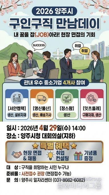 행사는 오는 4월 29일 오후 2시부터 4시까지 양주시청 대회의실에서 진행되며, 구직자는 사전 신청 또는 행사 당일 오후 1시 30분부터 현장 접수 후 면접에 참여할 수 있다. 참여를 희망하는 구직자는 이력서 등 지원 서류를 지참해야 한다.
