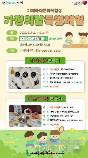 시민행정신문 강갑수 기자 | 거제시 목재문화체험장(동부면 거제중앙로 325, 거제자연휴양림 내 위치)은 가정의 달을 맞아 오는 5월 2일과 5월 3일 이틀간 『자개키링&발포세라믹 만들기 특별체험』을 운영한다고 밝혔다.