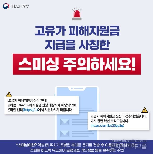 지원금 지급 시기에는 ‘지원 대상자 선정’, ‘고유가 지원금 수령 안내’ 등 신청을 유도하는 가짜 문자가 기승을 부린다. 이러한 문자에 포함된 인터넷 주소(URL)을 클릭하면 악성 앱이 설치되어 스마트폰 내 개인정보나 금융정보가 탈취될 위험이 크다.