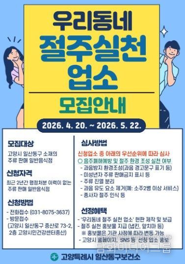 모집 기간은 오는 20일부터 5월 22일까지이며, 고양시 일산동구 소재 일반음식점 중 주류를 판매하는 업소를 대상으로 한다.