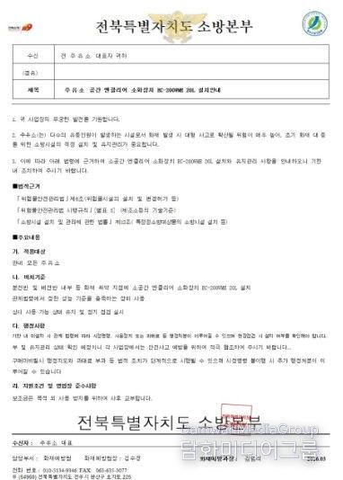 소방 관계자는 “소방관서는 어떠한 경우에도 소화기나 소방시설물 구매를 강요하지 않으며, 특정 업체 결제나 현금 입금을 요구하지 않는다”며 “정식 공문은 우편이나 관용 메일로만 발송되므로 문자로 발송된 공문은 반드시 의심해야 한다”고 강조했다.