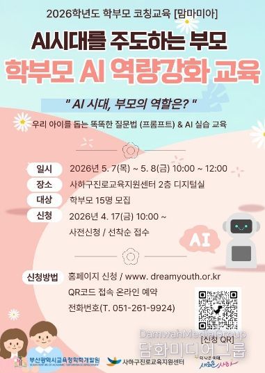 시민행정신문 강갑수 기자 | 사하구진로교육지원센터는 오는 5월 7일부터 5월 8일까지 양일간 학부모를 대상으로 'AI 시대, 부모의 역할은?' 특강을 운영한다.