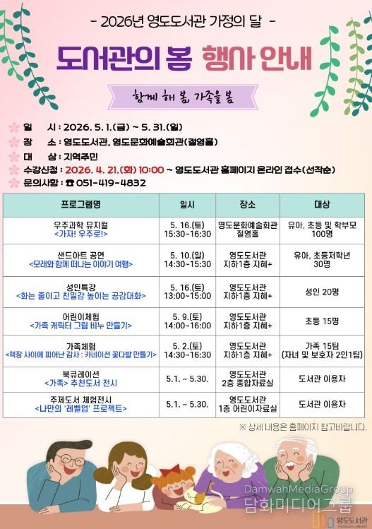 시민행정신문 강갑수 기자 | 영도구 영도도서관은 오는 5월 1일부터 31일까지 가정의 달을 맞아 온 가족이 함께 즐길 수 있는 '도서관의 봄' 행사를 개최한다고 밝혔다.