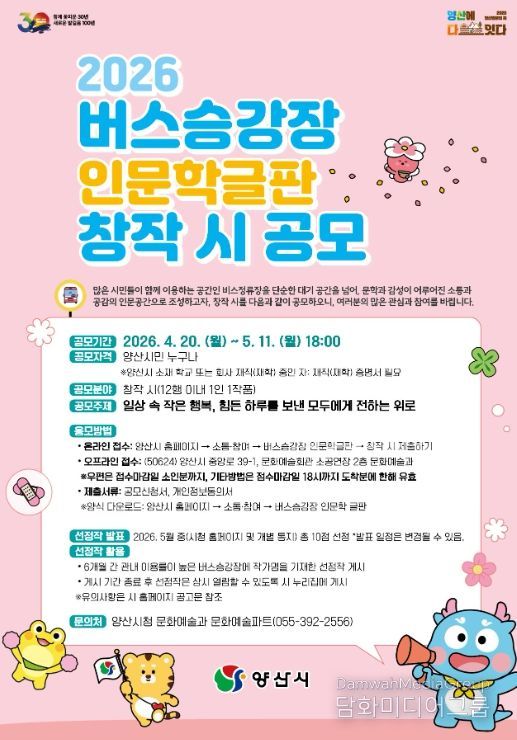 시민행정신문 강갑수 기자 | 양산시는 시민들의 일상 공간인 버스승강장을 문학적 감성이 흐르는 인문 공간으로 조성하기 위해 ‘2026 버스승강장 인문학글판 창작시 공모’를 추진한다.
