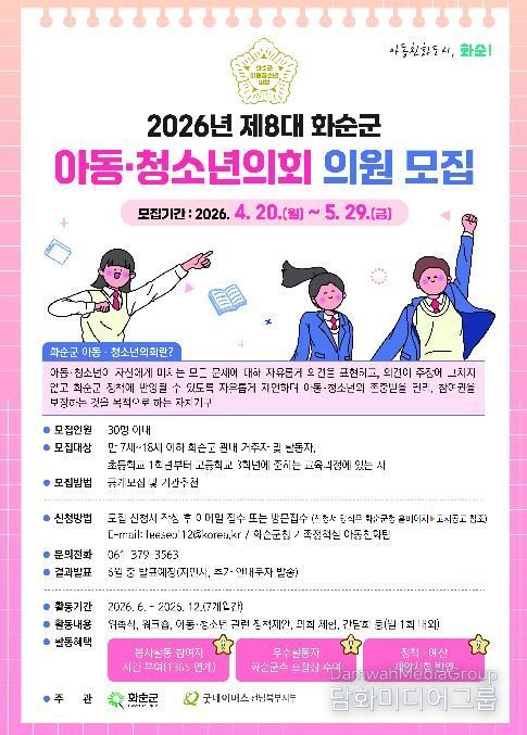 시민행정신문 강갑수 기자 | 화순군은 ‘2026년 제8대 화순군 아동·청소년의회’ 의원 30명을 오는 4월 20일부터 5월 29일까지 공개 모집한다고 밝혔다.