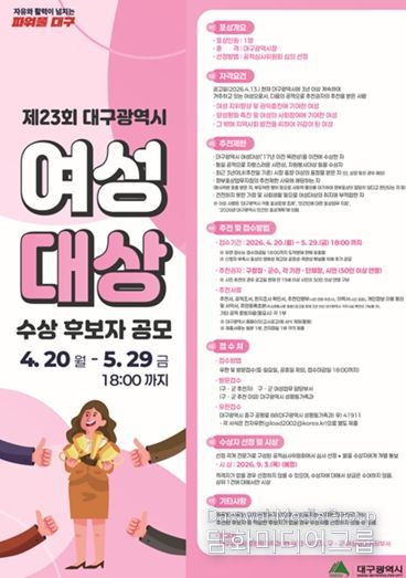 시민행정신문 강갑수 기자 | 대구광역시는 여성의 지위 향상과 양성평등 실현에 공헌한 여성 인재를 발굴·격려하기 위해 ‘2026년 제23회 대구광역시 여성대상’ 수상 후보자를 4월 20일부터 5월 29일까지 공개 모집한다.