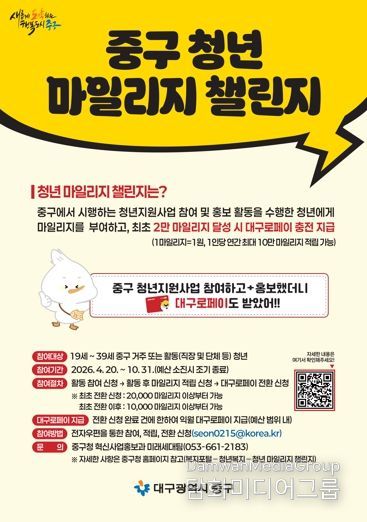시민행정신문 강갑수 기자 | 대구 중구는 청년들의 청년지원사업 참여를 확대하고 정책 인지도와 체감도를 높이기 위해 ‘청년 마일리지 챌린지’를 4월 20일부터 10월 31일까지 시행한다.