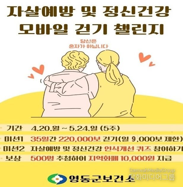 시민행정신문 기자 | 충북 영동군보건소는 군민의 정신건강 증진과 자살예방 인식 확산을 위해 ‘자살예방 및 정신건강 인식개선 모바일 걷기 챌린지’를 운영한다고 밝혔다.