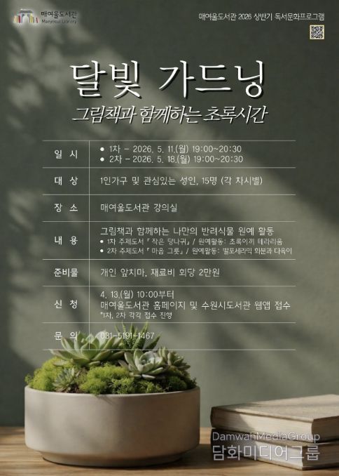 매여울도서관 관계자는 “그림책과 식물을 매개로 일상에 여유와 위로를 전하는 프로그램”이라며 “많은 시민들이 참여해 힐링의 시간을 보내길 바란다”고 말했다.