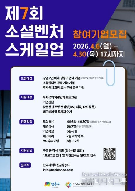 시민행정신문 강갑수 기자 | 서울 성동구는 관내 소셜벤처기업을 대상으로 투자 유치 역량 강화를 위해 2026년 제7회 소셜벤처 스케일업 프로그램 참여기업을 모집한다고 밝혔다.
