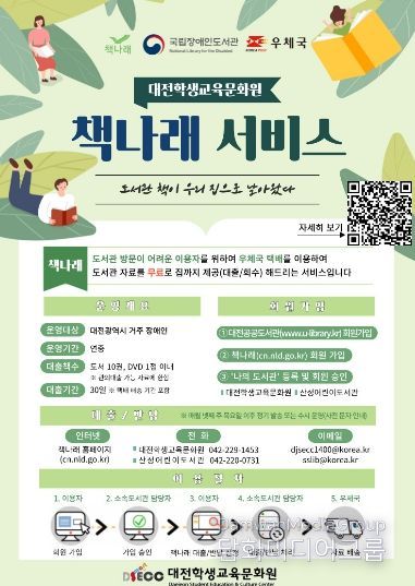 지원 대상은 등록 장애인 및 도서관 방문이 어려운 고령자 등으로, 대전공공도서관 회원 가입 후 책나래 회원으로 승인받으면 이용 가능하다. 이용자는 도서관 누리집에서 대출 가능한 자료를 검색한 뒤 신청할 수 있으며, 도서관에서 자료를 발송하고 이용 후에는 우체국 택배를 통해 편리하게 반납할 수 있다.