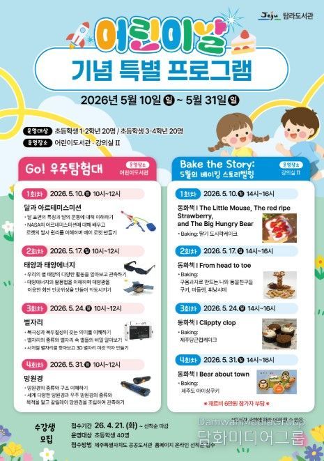 시민행정신문 기자 | 제주시 탐라도서관은 어린이날을 맞아 천문학과 베이킹을 주제로 한 특별 체험 프로그램을 5월 10일부터 5월 31일까지 운영한다.