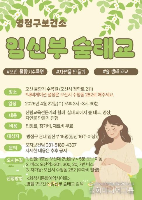 시민행정신문 기자 | 화성특례시 병점구보건소는 임신부의 정서적 안정과 건강한 출산을 지원하기 위해 오는 22일 ‘임신부 숲태교 프로그램’을 운영한다고 밝혔다.