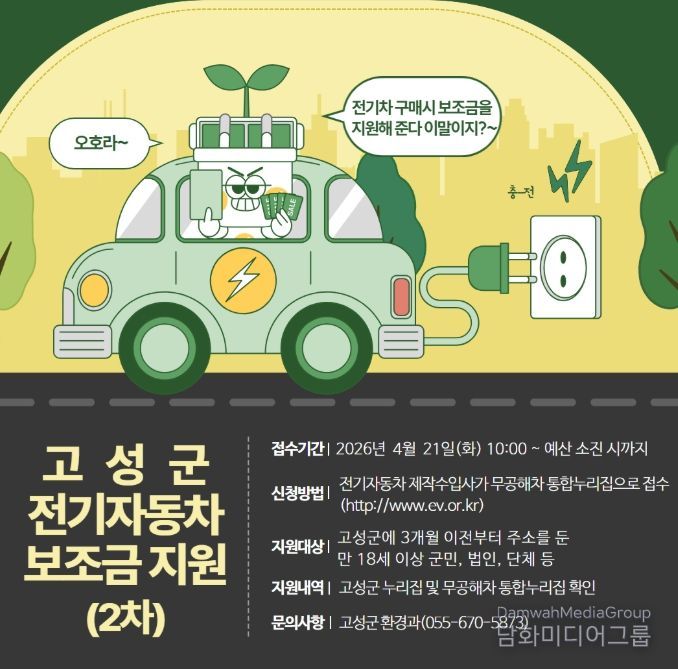 시민행정신문 강갑수 기자 | 고성군은 4월 21일부터 전기자동차 보급사업 2차 신청을 앞당겨 추진한다고 밝혔다. 전기자동차 수요 증가와 대기질 개선에 대응하기 위한 조치다.